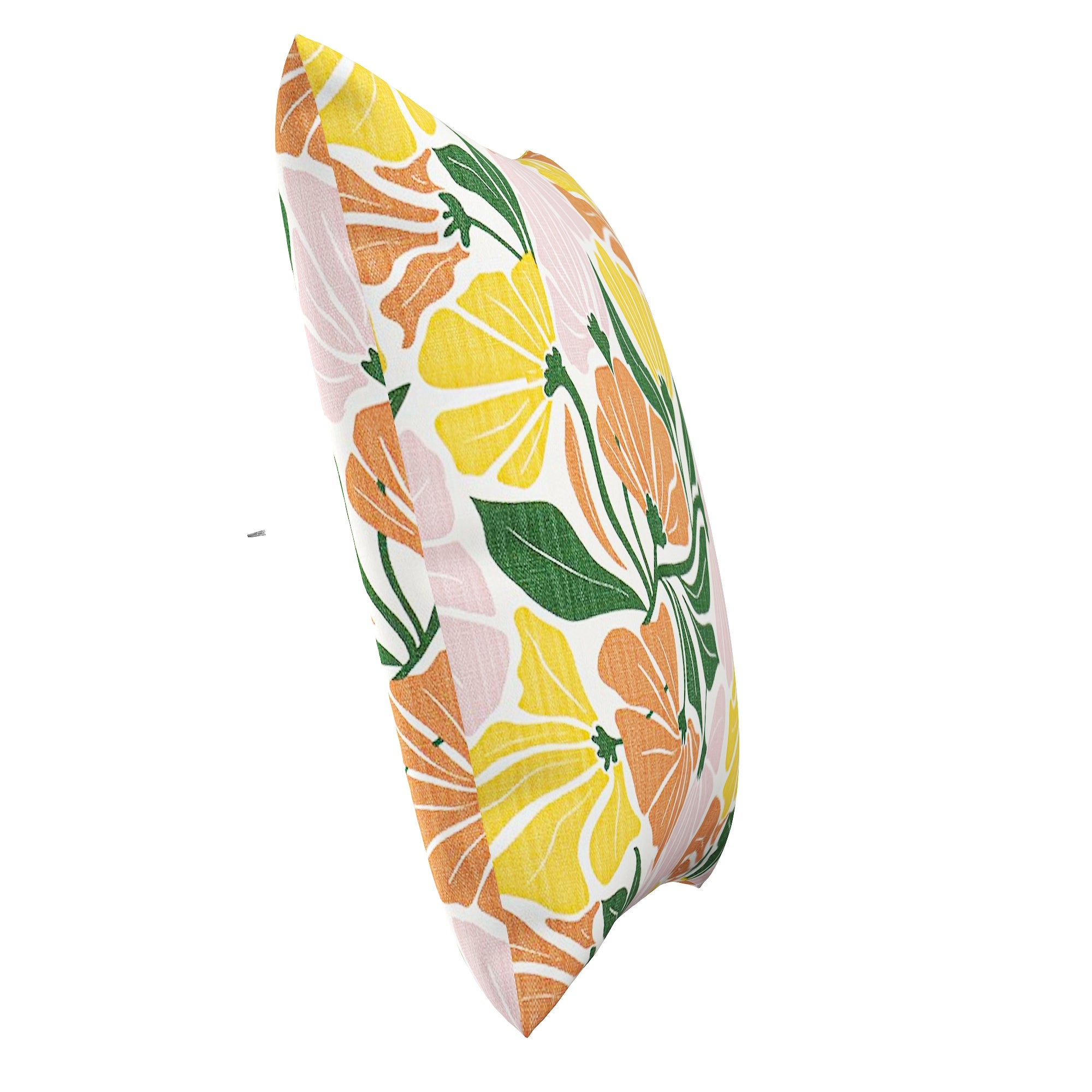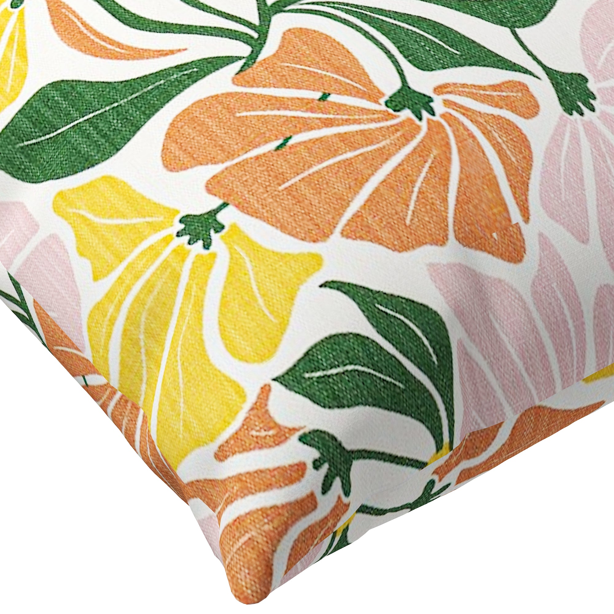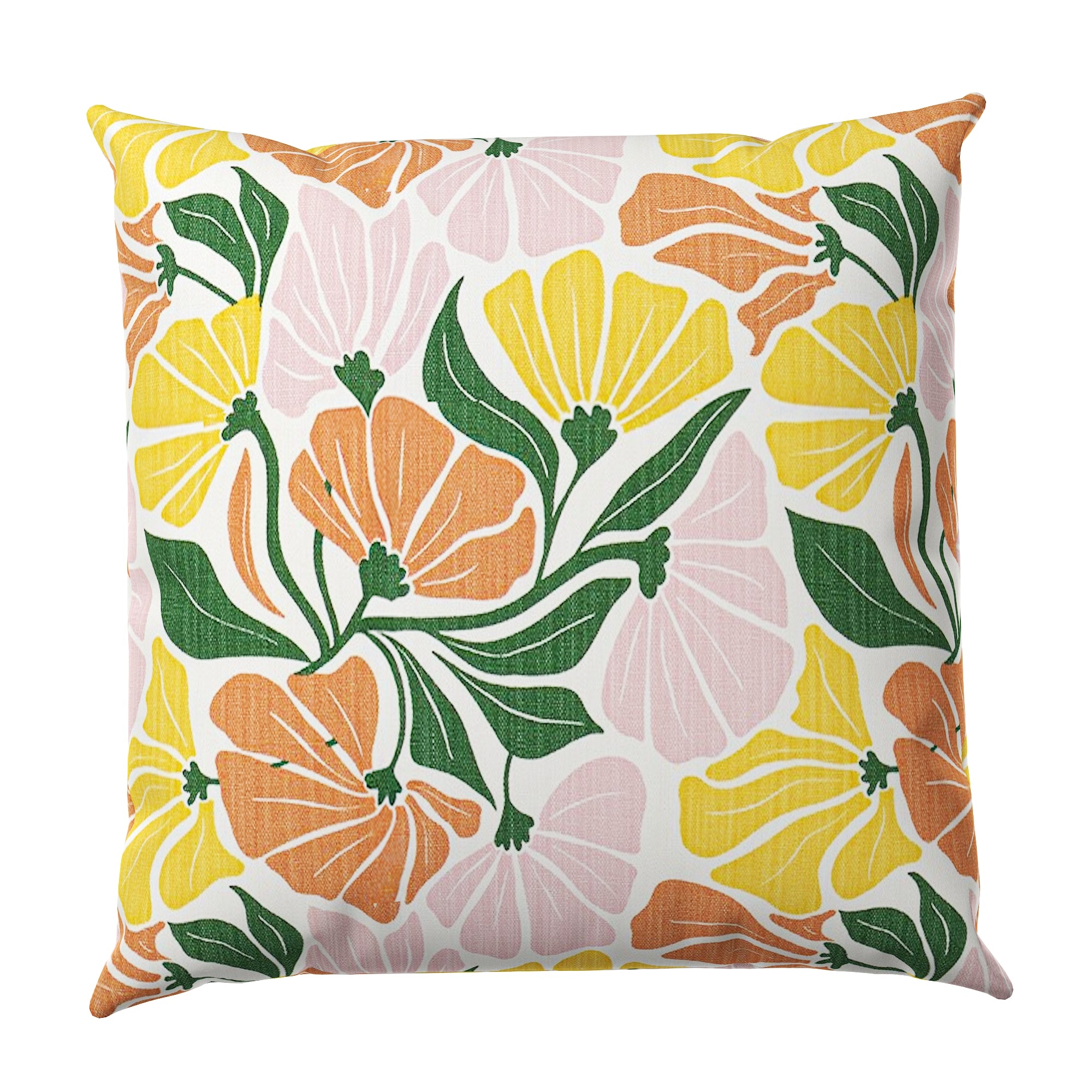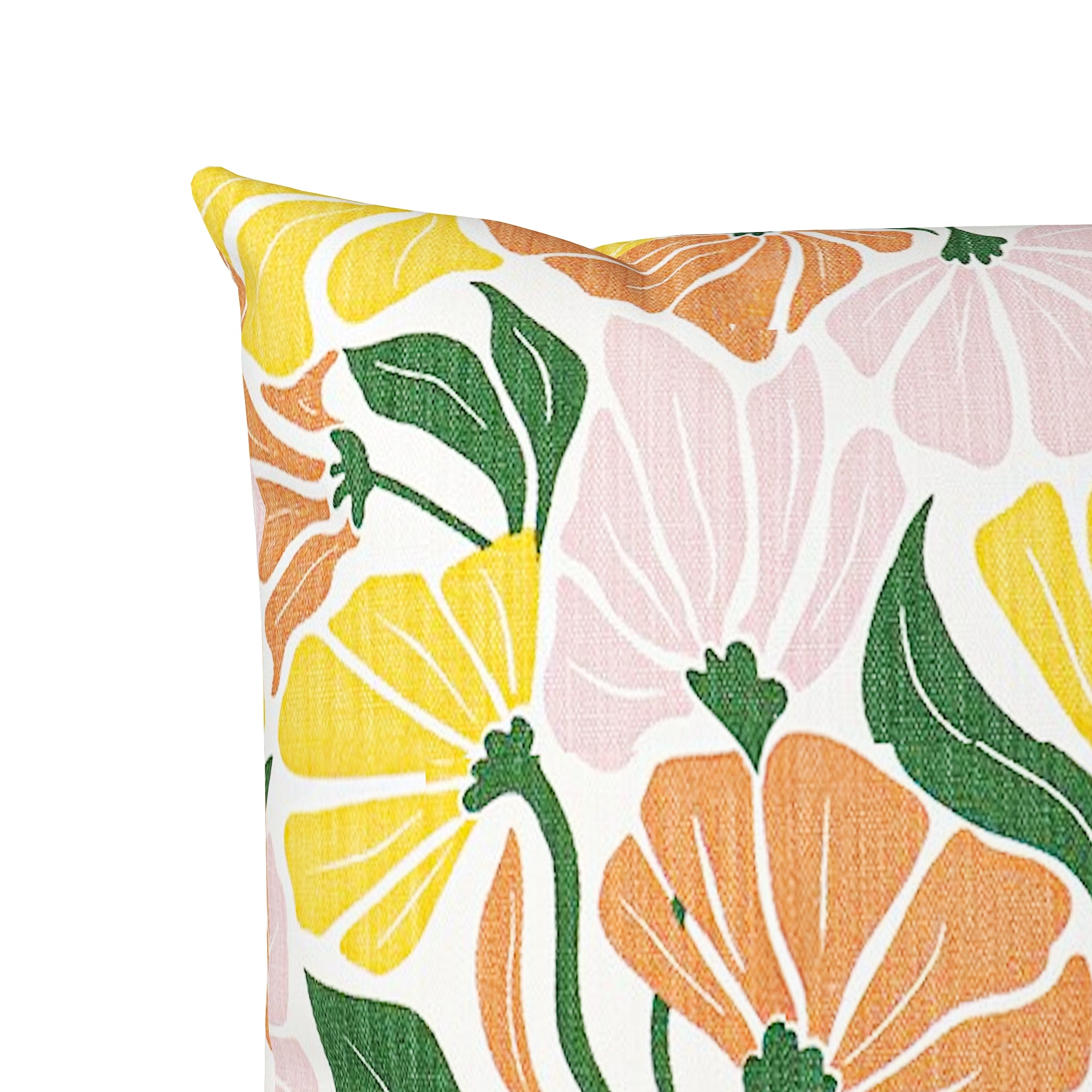 The fabric showcases a playful, large-scale floral pattern in a curated palette of terracotta orange, sunshine yellow, soft petal pink, and forest green. The stylized, hand-drawn blooms and flowing leaves create a dynamic rhythm that instantly elevates a sofa, bed, or accent chair. Whether your decor is Boho Chic, Mid-Century Modern, or Eclectic, this pillow provides that sought-after "retro-modern" vibe.
